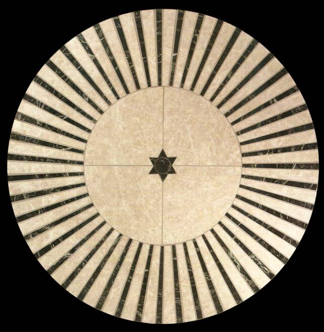 Soft graded gray white tones are split asunder by powerful blue bursts which flow outward like the spokes of a great wheel. At the center of this effect is a single star, set amidst for plates, serving as the centerpiece of the entire effect.